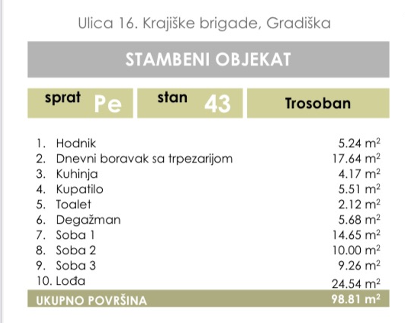 Gradiška, Ulica 16. Krajiške brigade. Prodaje se četvorosoban stan u izgradnji ukupne površine 98,81 m2 na povučenoj etaži (peti sprat), stambenog objekta koji će da posjeduje lift.