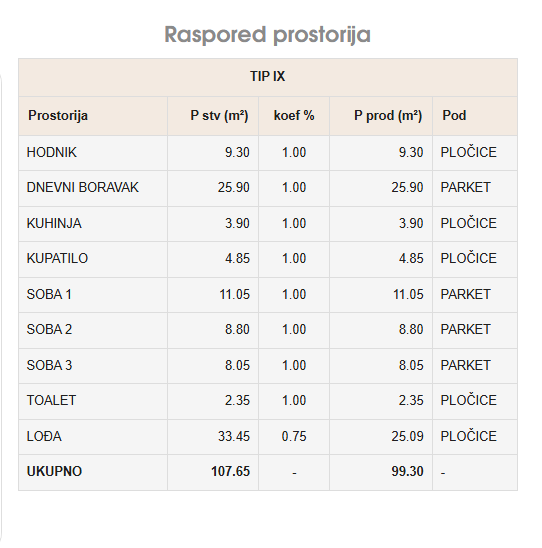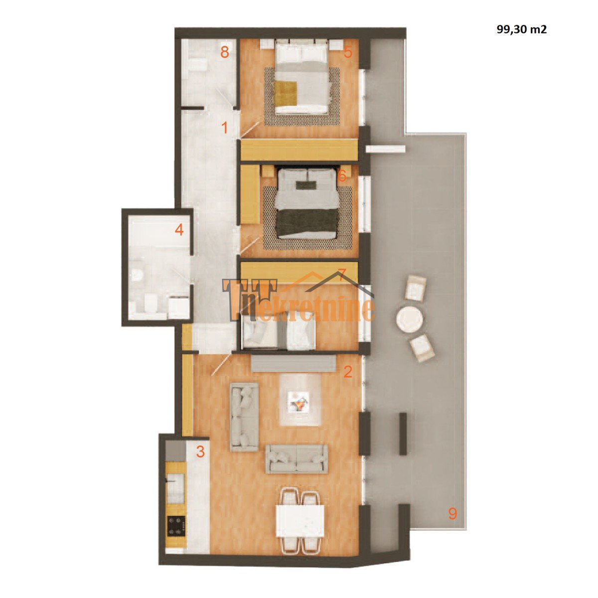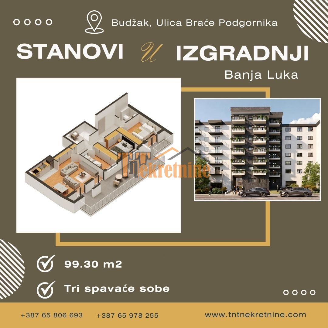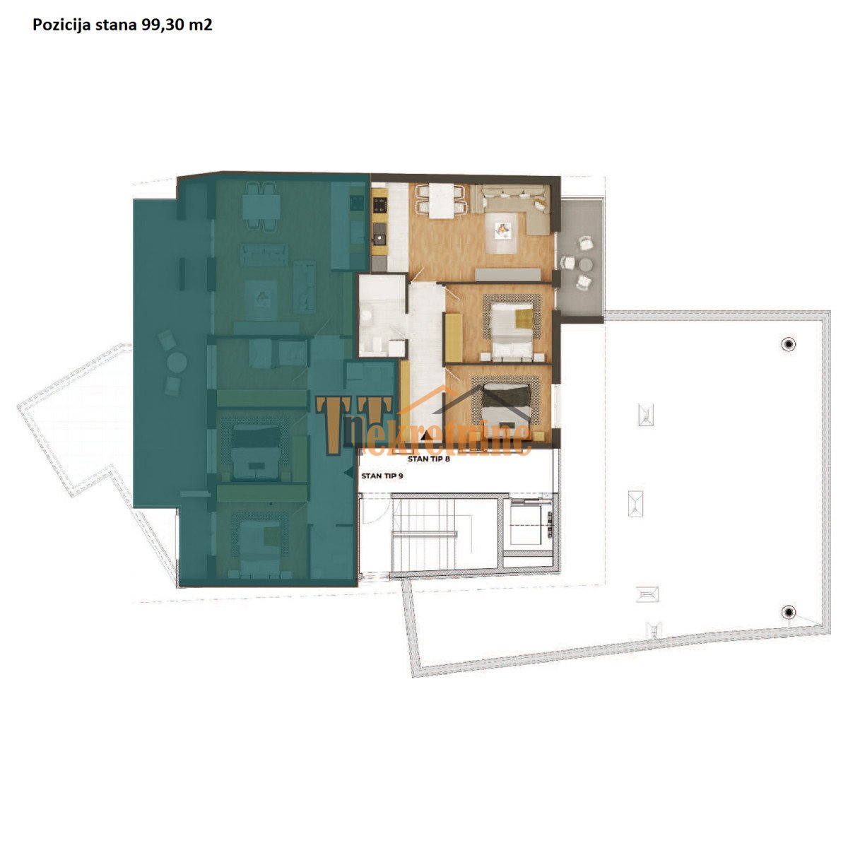 Prodaje se četvorosoban stan u izgradnji ukupne površine 99,30 m2 na VII spratu stambeno poslovnog objekta “SAND CITY” koji će da posjeduje lift.