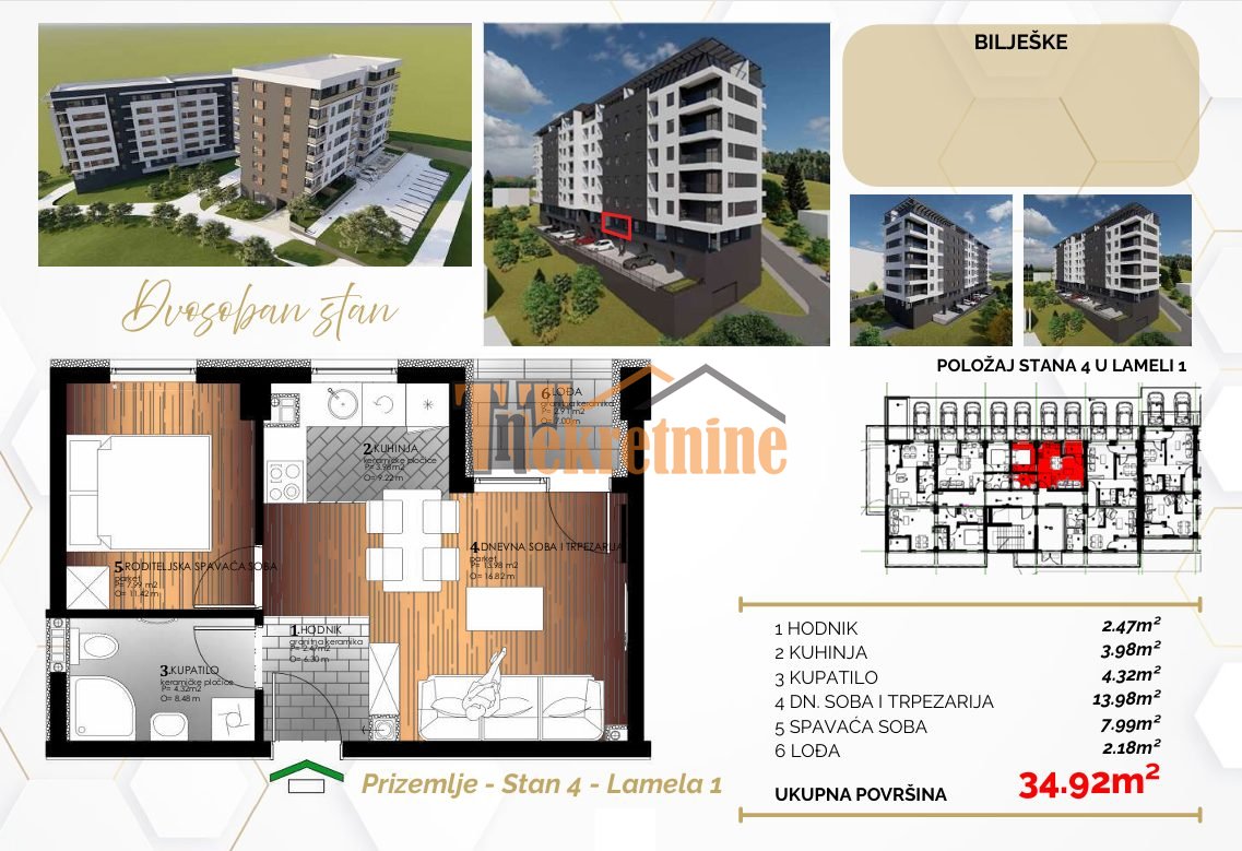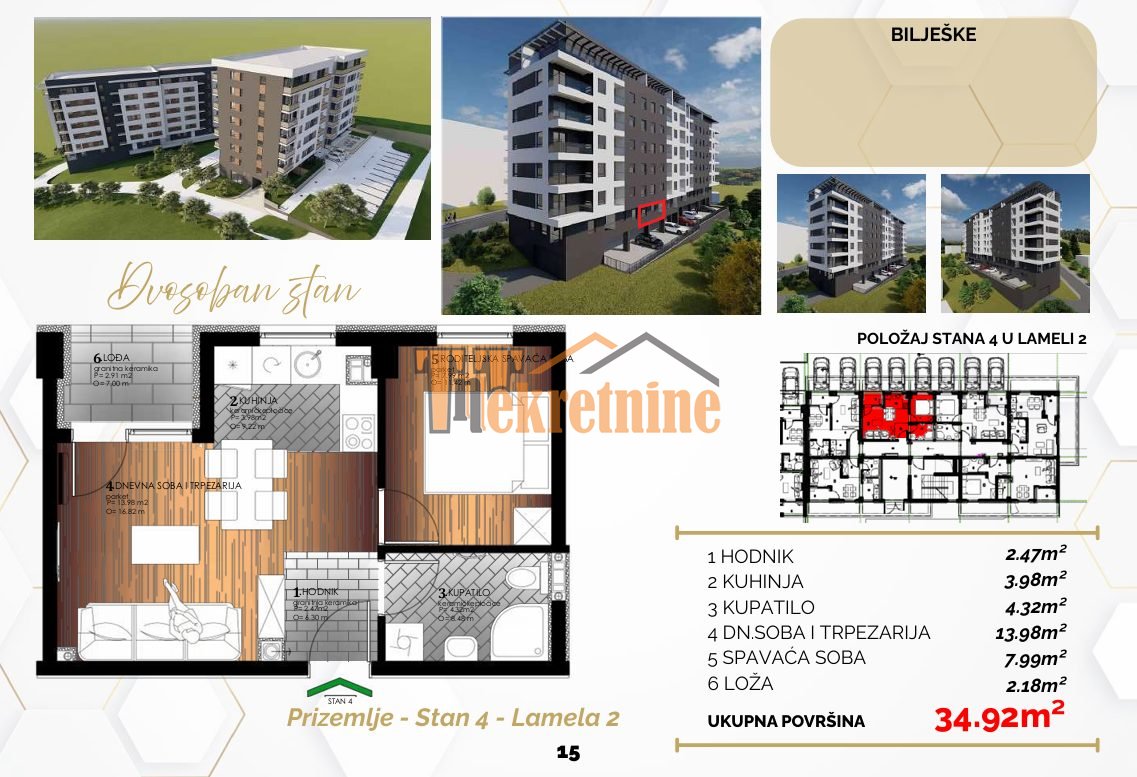 Lamela 1 i Lamela 2 – prodaje se dvosoban stan u izgradnji ukupne površine 34,92 m2 u prizemlju stambene zgrade.