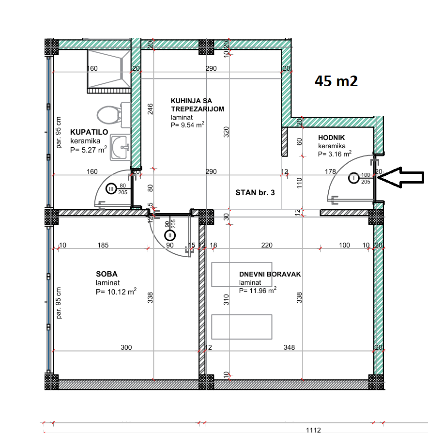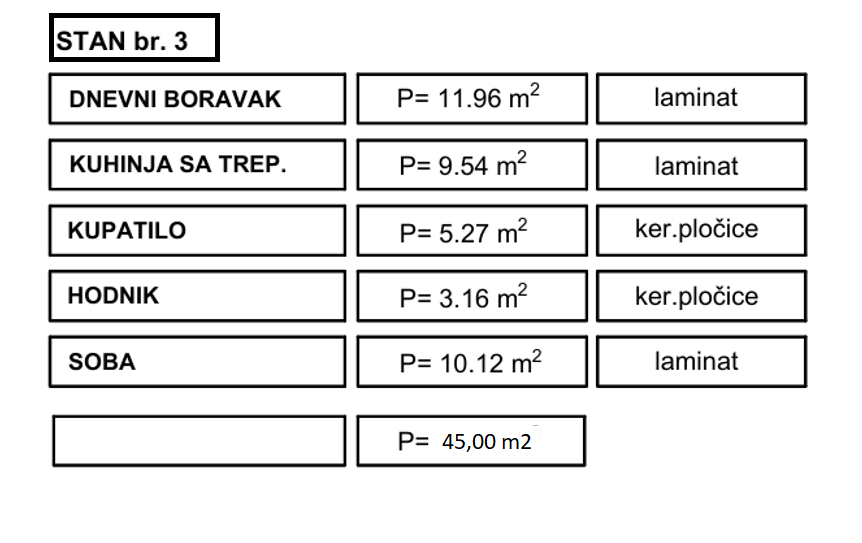 Strukturu stana čini: ulazni hodnik, dnevni boravak, kuhinja sa trpezarijom, kupatilo i spavaća soba.
