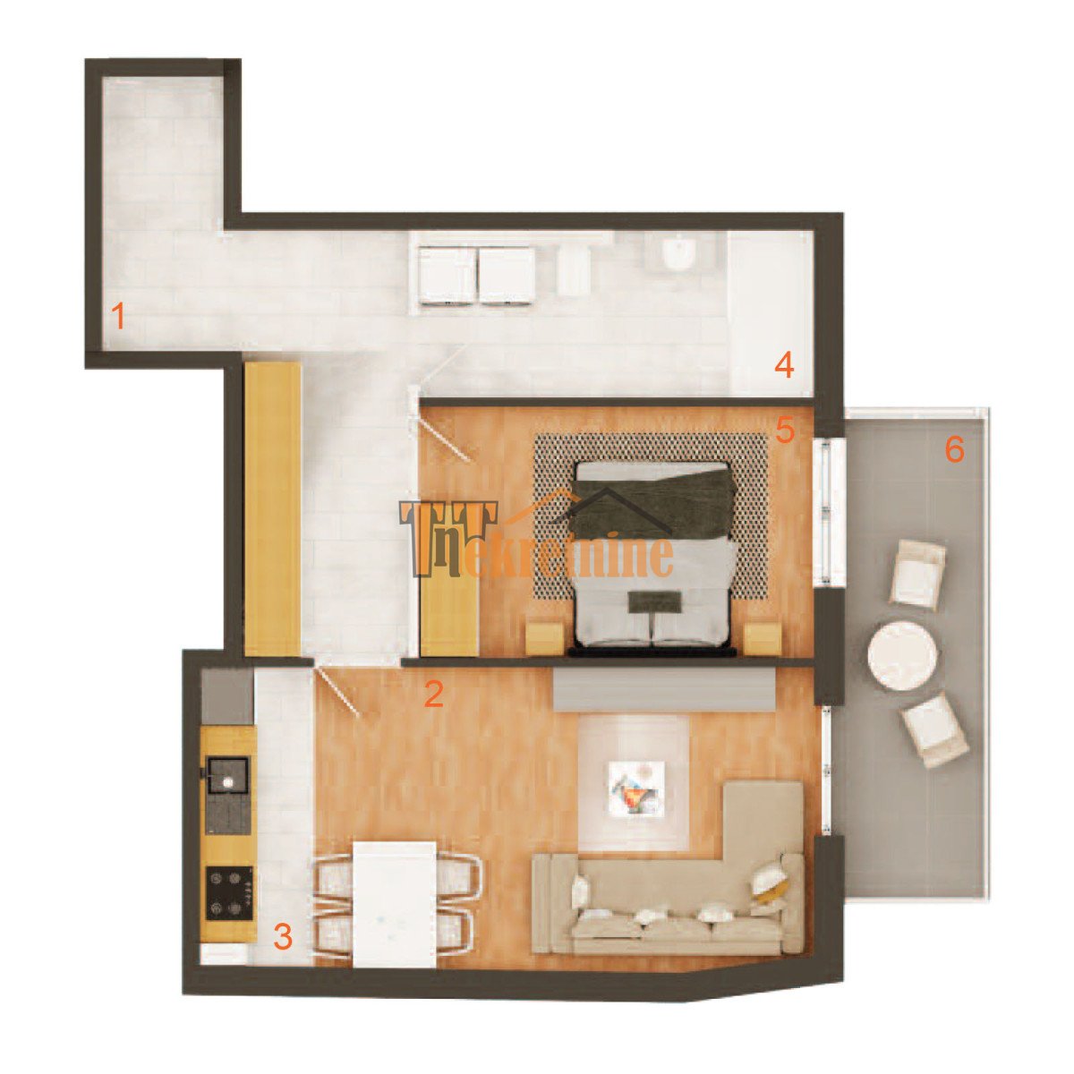 Strukturu stana čini: ulazni hodnik, hodnik, kupatilo, spavaća soba, kuhinja sa trpezarijom u sklopu dnevnog boravka sa izlazom na lođu.