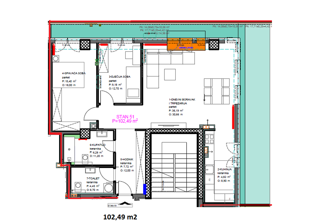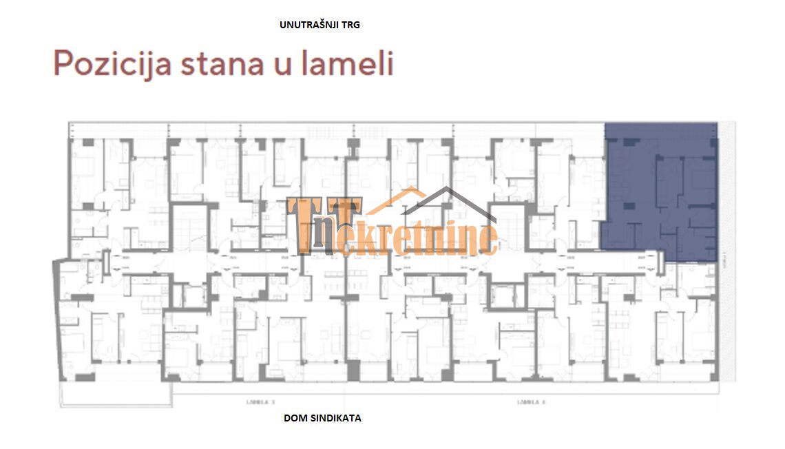 LAMELA 4 – prodaje se konforan trosoban stan u izgradnji ukupne površine 102,49 m2 na VII spratu stambeno poslovnog komplexa “Palata”, zgrada će da posjeduje lift.