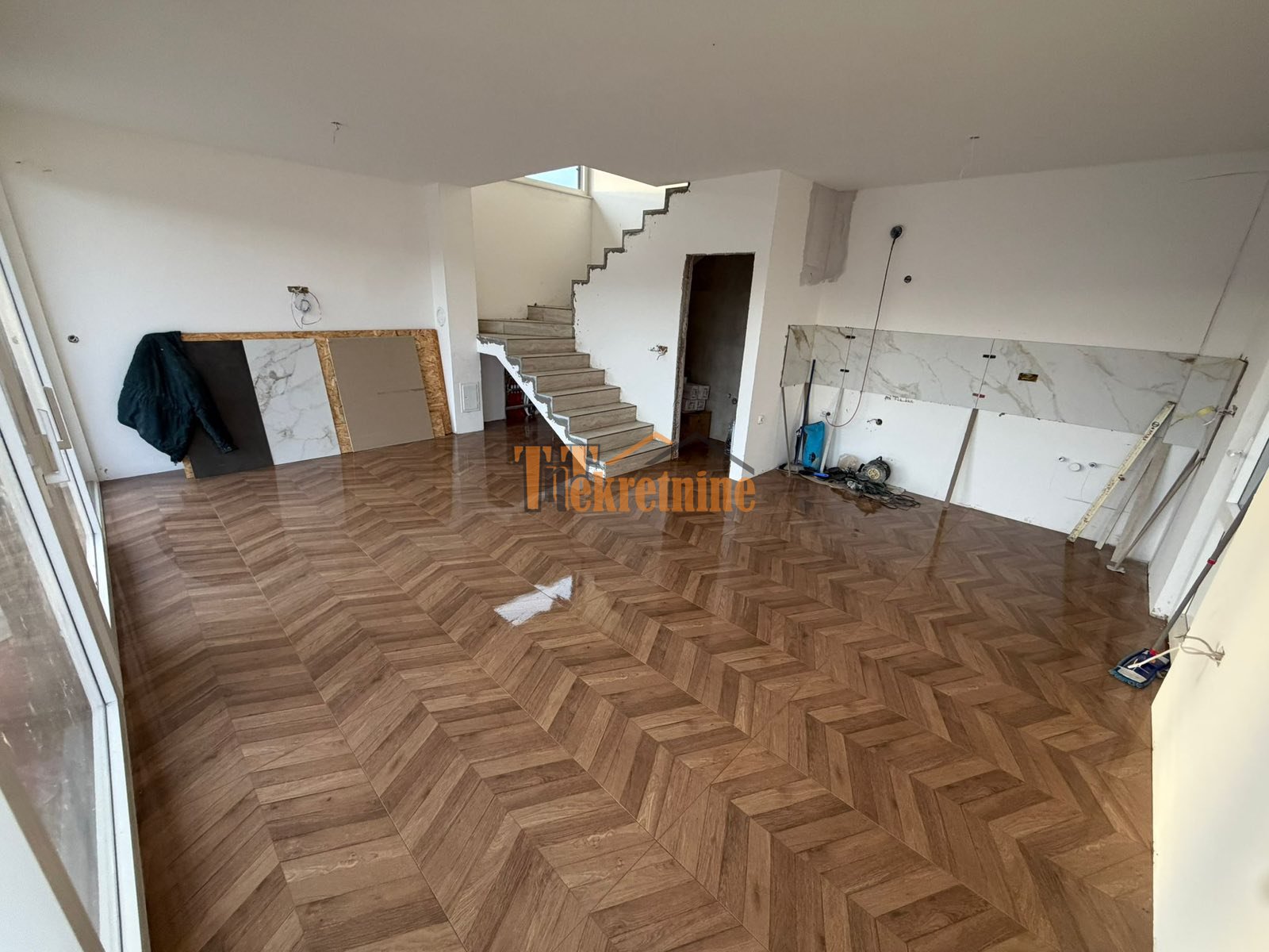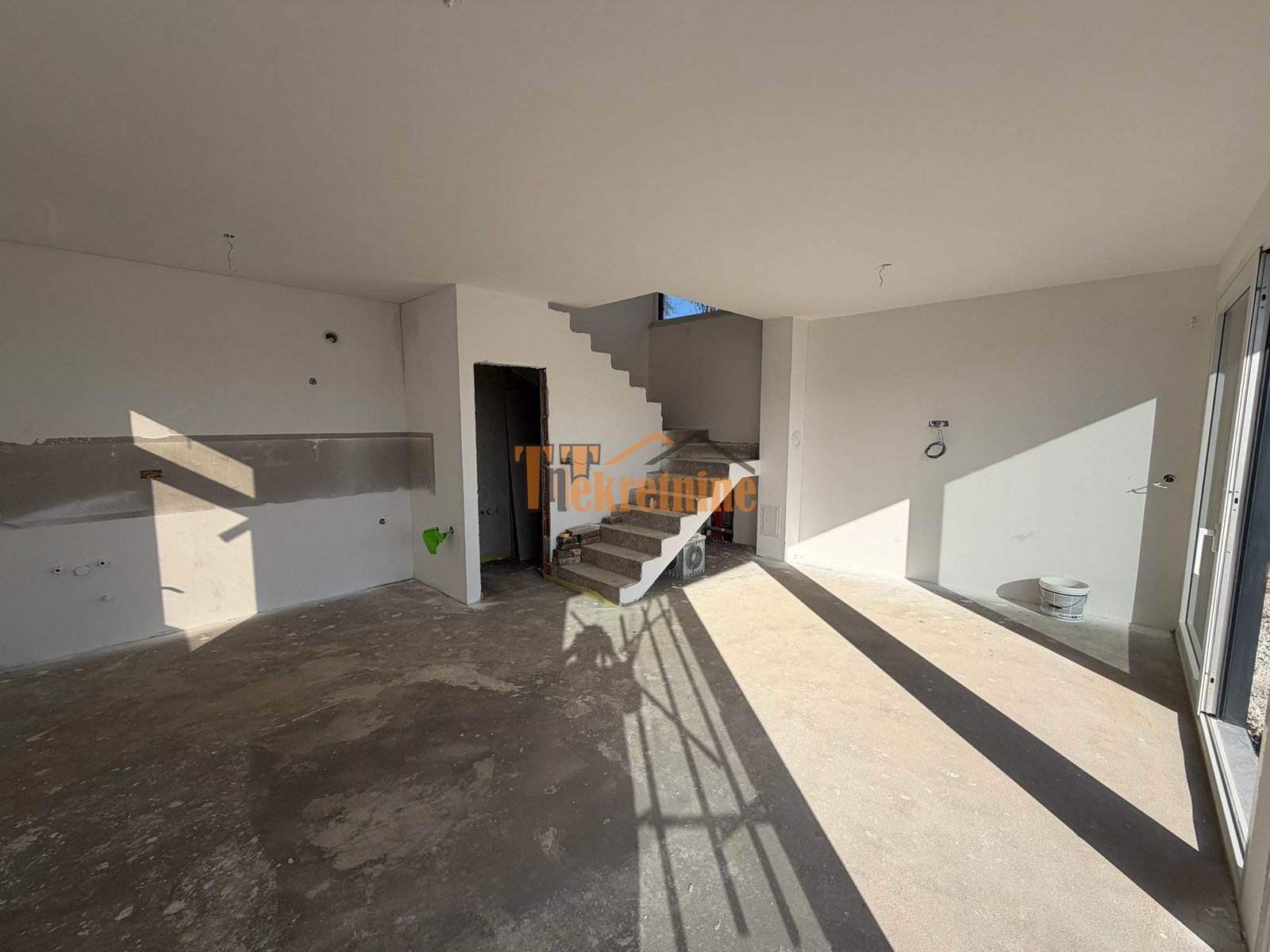 – prizemlje se sastoji od dnevnog boravka sa velikim staklenim površinama sa HST kliznim profilima, kuhinje sa trpezarijskim djelom (ostavljena instalaciona cijev za kuhinjsku napu), toaleta (wc šolja sa Geberit ugradnim vodokotlićem, umivaonik sa ogledalom i ventilaciom);