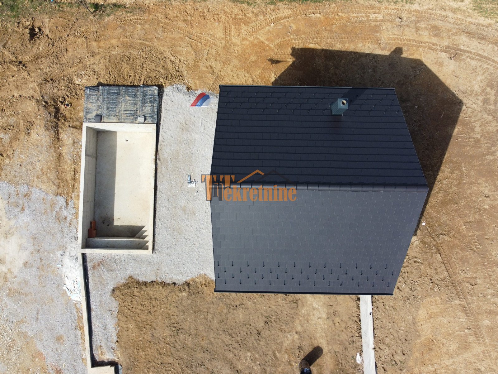 Vanjski sadržaj čini bazen dimenzija 7x4m, tehnička prostorija uz bazen 4x2m, stepenice u bazenu, pumpa, klupa sa četiri hidromasažne mlaznice, dva skimera, rasvjetla i bazenska folija – uređeno dvorište sa betonskim kockama.