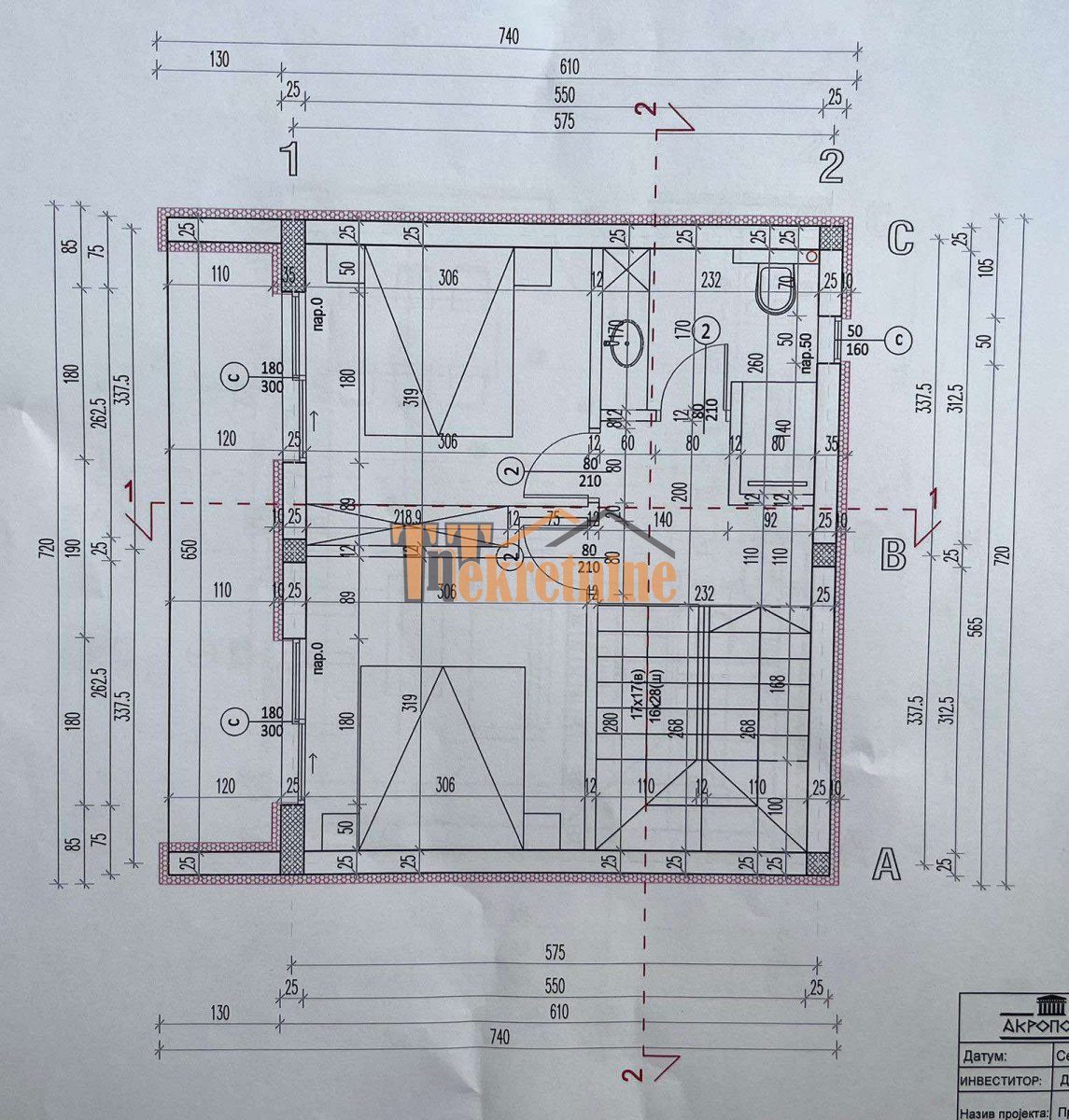 – unutrašnje stepenište sa galerijom (ispod stepenica je smještena tehnička prostorija u kojoj se nalazi elektro kotao za grijanje “Vaillant” i bojler od 80 l) vode na I sprat koji se sastoji od hodnika, dvije spavaće sobe i konfornog kupatila (wc šolja sa Geberit ugradnim vodokotlićem, ugradni bide, umivaonik sa ogledalom, veliki stakleni tuš i ventilator za ventilaciju prostora); – potkrovlje vikend kuće koje je pod kosinama čini pomoćna prostorija od 5m2, maksimalne visine 140cm;