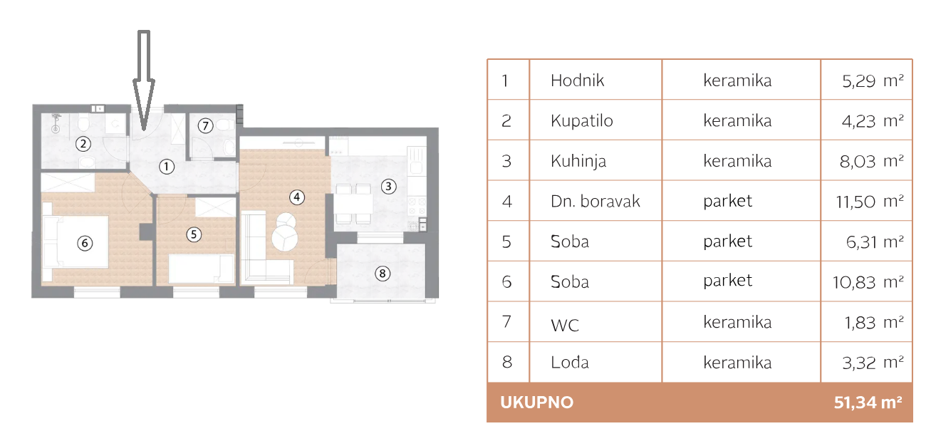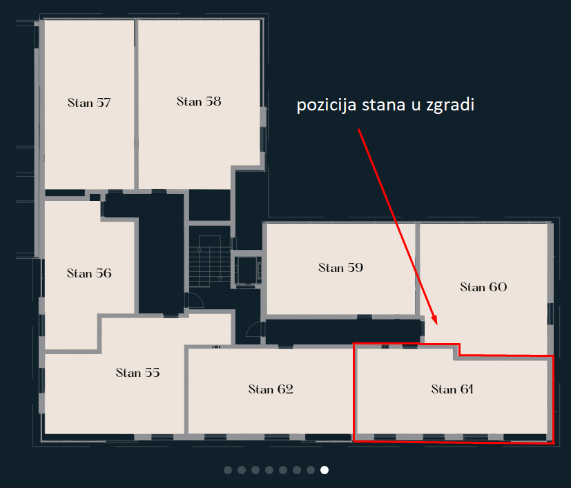 Lamela 2 – prodaje se dvosoban stan u izgradnji ukupne površine 51,34 m2 na VII spratu (povučena etaža) stambeno/poslovnog objekta koji će da posjeduje lift.