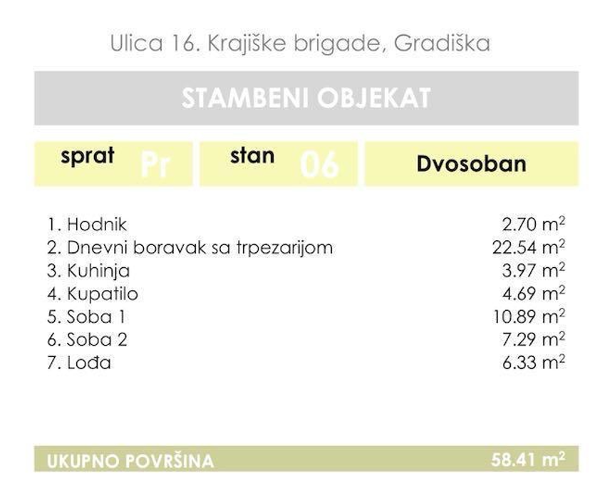 Gradiška, Ulica 16. Krajiške brigade. Prodaje se trosoban stan u izgradnji ukupne površine 58,41 m2 u prizemlju i na I, II, III i IV spratu stambenog objekta koji će da posjeduje lift.