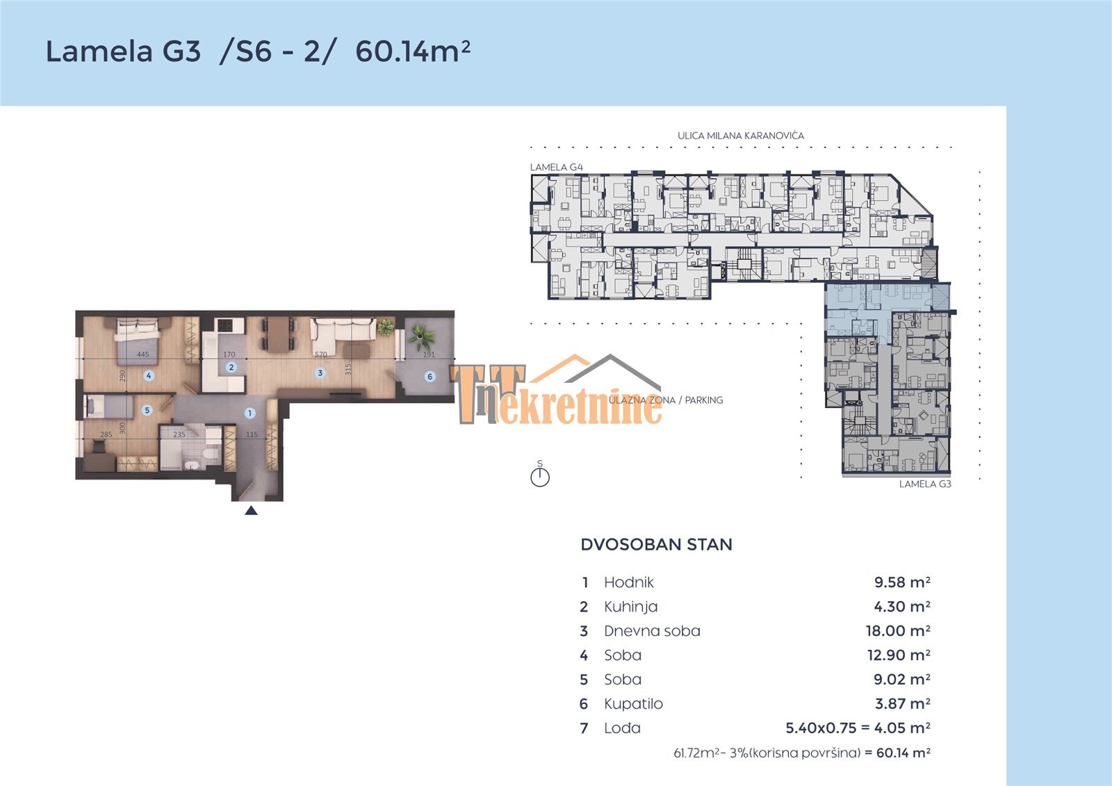 Prodaje se trosoban stan u izgradnji ukupne površine 60,14 m2 na II spratu stambeno poslovnog objekta koji će da posjeduje lift.