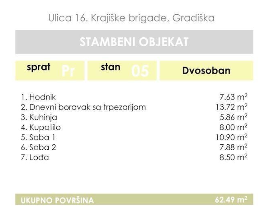 Gradiška, Ulica 16. Krajiške brigade. Prodaje se trosoban stan u izgradnji ukupne površine 62,49 m2 u prizemlju i na I, II, III i IV spratu stambenog objekta koji će da posjeduje lift.