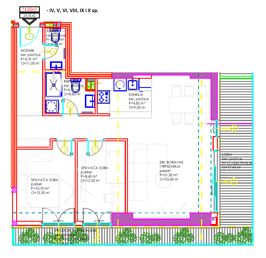 LAMELA 5 – prodaje se trosoban stan u izgradnji ukupne površine 74,85 m2 na IV, V, VI, VIII, IX i X spratu stambeno poslovnog komplexa “Palata”, zgrada će da posjeduje lift.