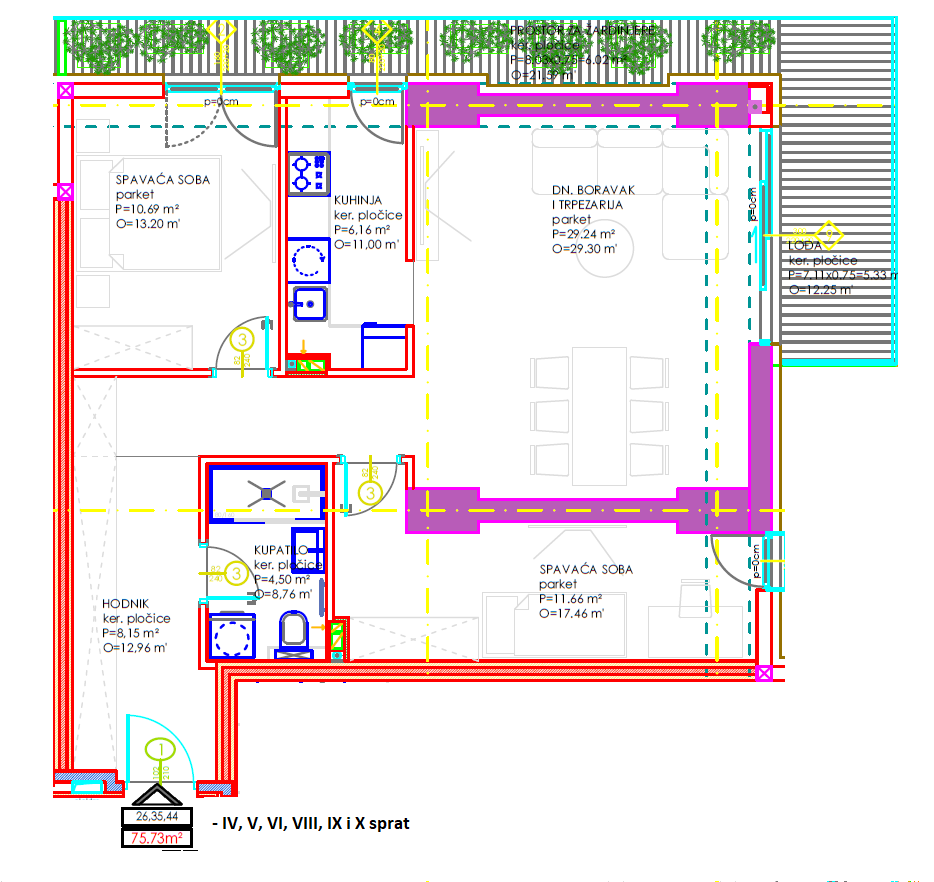 LAMELA 5 – prodaje se trosoban stan u izgradnji ukupne površine 75,73 m2 na IV, V, VI, VIII, IX i X spratu stambeno poslovnog komplexa “Palata”, zgrada će da posjeduje lift.